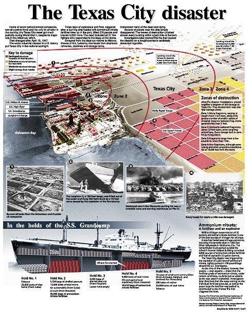 A French ship, the SS Grandcamp, loaded with 2300 tons of ammonium nitrate fertilizer in the port city of Texas City, across from Galveston, explodes in the channel leading to Houston, devastating the docks and the town.