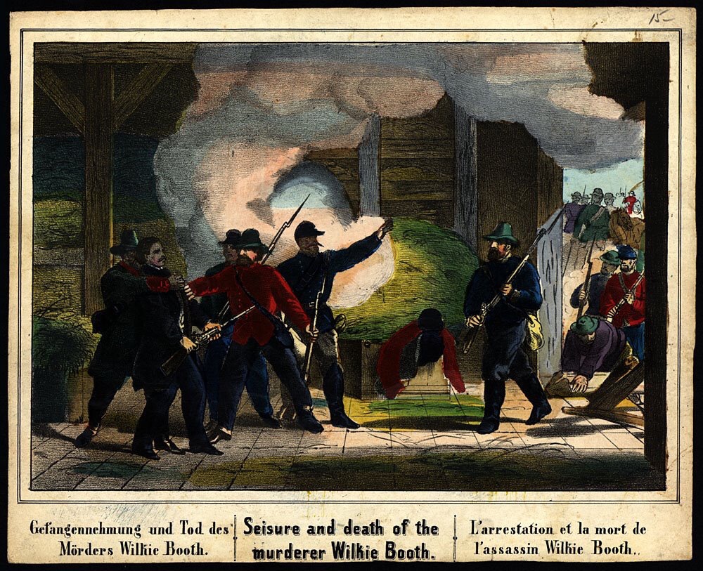 Union Army forces track down John Wilkes Booth 12 days after he assassinated President Lincoln. In the meantime, he had been hidden by Confederates, treated by Doctor Samuel Mudd (your name is mud) and hidden in a barn on the Garrett farm in Virginia, where he was found.