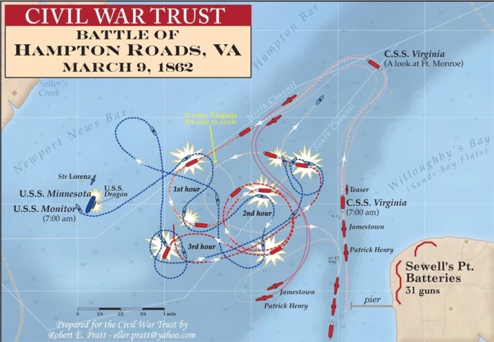 She was confronted by the Union version of the ironclad…the USS Monitor. The two new iron ships battered away at each other for over three hours without seriously damaging each other, and then withdrew.